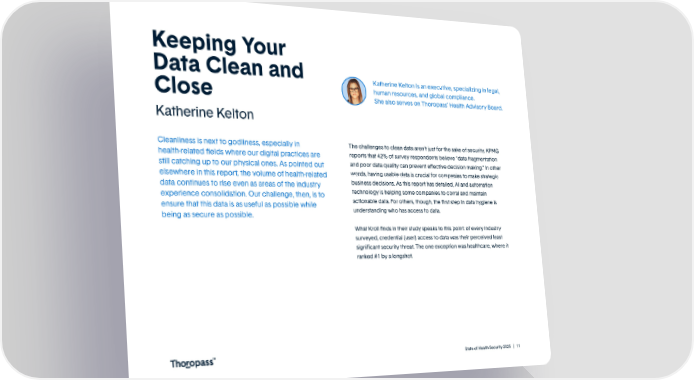 Keeping Your Data Clean and Katherine Kelton is an executive, specializing in legal, If fragmented data can inhibit decision making, it can also hinder human resources, and global compliance. collaboration. But clearly collaboration is not without its risks, Close She also serves on Thoropass’ Health Advisory Board. according to Kroll. Because the healthcare industry can be both siloed and spread out by its very nature (not even considering the vast Katherine Kelton network of third party vendors on which most organizations rely), it’s both understandable and unfortunate that this one particular threat is still freed over, especially since email compromises continue to be Cleanliness is next to godliness, especially in The challenges to clean data aren’t just for the sake of security. KPMG the leading source of threat faced by healthcare organizations. health-related fields where our digital practices are reports that 42% of survey respondents believe “data fragmentation As a result, it’s up to us in the industry to confront these two still catching up to our physical ones. As pointed out and poor data quality can prevent eective decision making.” In other issues–data hygiene and data access–as one in 2025. Where AI and elsewhere in this report, the volume of health-related words, having usable data is crucial for companies to make strategic automation can help with data hygiene to a large degree, user access data continues to rise even as areas of the industry business decisions. As this report has detailed, AI and automation remains a unique cybersecurity concern that can be addressed experience consolidation. Our challenge, then, is to technology is helping some companies to corral and maintain through consolidated credentialing and monitoring. Maintaining your ensure that this data is as useful as possible while actionable data. For others, though, the first step in data hygiene is myriad regulatory and compliance frameworks through a single being as secure as possible. understanding who has access to data. dashboard where you can also control user access at the employee What Kroll finds in their study speaks to this point: of every industry level remains the gold standard for addressing data hygiene and surveyed, credential (user) access to data was their perceived least access. Likewise, regular training and ensuring that any HIPAA security significant security threat. The one exception was healthcare, where it controls (such as use of MFA) are enforced consistently across systems ranked #1 by a longshot. and end users is more important than ever. Healthcare is not unique in facing the growing importance of personal/patient data and working across dispersed teams. But given how valuable our data is, and how the frequency and severity of aacks are going up, it is more important than ever to look for technology solutions that enable secure, sustainable growth in 2025. State of Health Security 2025 | 11