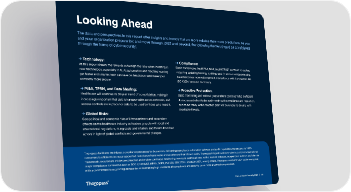Looking Ahead The data and perspectives in this report oer insights and trends that are more reliable than mere predictions. As you and your organization prepare for, and move through, 2025 and beyond, the following themes should be considered through the frame of cybersecurity: > Technology: > Compliance: As this report shows, the rewards outweigh the risks when investing in Basic frameworks like HIPAA, NIST, and HITRUST continue to evolve, new technology, especially in AI. As automation and machine learning requiring updating training, auditing, and (in some cases) pentesting. get faster and smarter, tech can save on headcount and make your As AI becomes more wide-spread, compliance with frameworks like company more secure. ISO 42001 become necessary. > M&A, TPRM, and Data Sharing: > Proactive Protection: Healthcare will continue its 30-year trend of consolidation, making it Basic monitoring and minimal preparations continue to be inecient. increasingly important that data is transportable across networks, and An increased eort to be audit-ready with compliance and regulation, access controls are in place for data to be used by those who need it. and to be ready with a reaction plan will be crucial to dealing with inevitable threats. > Global Risks: Geopolitical and economic risks will have primary and secondary eects on the healthcare industry as leaders grapple with local and international regulations, rising costs and inflation, and threats from bad actors in light of global conflicts and governmental changes. Thoropass facilitates the infosec compliance processes for businesses, delivering compliance automation soware and audit capabilities that enables its 1000+ customers to eciently increase supported compliance frameworks and accelerate their infosec audits. Thoropass integrates directly with its customers operational frameworks to automate evidence collection and enable continuous monitoring to ensure audit readiness. With a team of in-house, independent auditors proficient in major compliance frameworks such as SOC 2, HITRUST, HIPAA, GDPR, PCI DSS, ISO 27001, and ISO 42001, among others, Thoropass conducts 500+ audits every year, with a commitment to supporting companies in maintaining high standards of compliance and security. Learn more at www.thoropass.com State of Health Security 2025 | 14